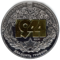 | На аверсі монети розміщено: угорі малий Державний Герб України та напис півколом НАЦІОНАЛЬНИЙ БАНК УКРАЇНИ; у центрі - композицію, що символізує перемогу: цифри 1944 (позолочені: локальна позолота, вміст золота в чистоті не менше ніж 0,0005 г. позолочені), над якими - зображення салюту, унизу - лаврова гілка зі стрічкою та зіркою, праворуч над зіркою - рік карбування монети 2014; унизу напис півколом - ДВАДЦЯТЬ ГРИВЕНЬ. |