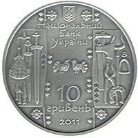 На аверсі монети розміщено: угорі малий Державний Герб України, під яким стилізований напис - НАЦІОНАЛЬНИЙ/БАНК/УКРАЇНИ, у центрі - стилізоване зображення двох пташок, ліворуч і праворуч від яких вироби коваля - давньоруська зброя та предмети побуту, унизу написи: 10/ ГРИВЕНЬ/2011.