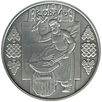 Присвячена ковальству - обробленню заліза методом гарячого кування. Уже в Х - ХІІ ст. ковальська майстерність досягла такого високого рівня, що навіть деякі способи оброблення заліза та технології виготовлення знарядь праці, предметів побутового призначення без суттєвих змін дійшли до нашого часу. Монету виготовлено з використанням технології патинування.