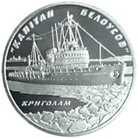 На реверсі монети зображено криголам серед криг, на задньому плані – судно на чистій воді та розміщено написи: угорі півколом – “КАПІТАН БЄЛОУСОВ”, унизу на дзеркальному тлі горизонтально – КРИГОЛАМ. |