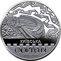 На реверсі монети зображено композицію: Київська фортеця (вид із висоти пташиного польоту), праворуч від якої – схема укріплень фортеці; унизу написи: КИЇВСЬКА (на дзеркальному тлі), ФОРТЕЦЯ/XVIII–XIX ст. (на тлі абрису зубців фортеці). |