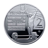 На аверсі монети розміщено: угорі, на рельєфному тлі - малий Державний Герб України, під яким - напис УКРАЇНА; постать спортсмена з переможно піднятими руками біля штанги; ліворуч від нього на дзеркальному тлі - стилізоване спортивне табло, на якому відображені олімпійський та світовий рекорди; праворуч - рік карбування монети та номінал 2018/2/ГРИВНІ, логотип Банкнотно-монетного двору Національного банку України (унизу).