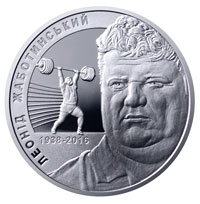На реверсі монети зображено портрет Леоніда Жаботинського, ліворуч від якого роки його життя 1938 - 2016, постать спортсмена зі штангою та напис півколом ЛЕОНІД ЖАБОТИНСЬКИЙ.