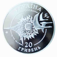 | На аверсі монети в намистовому колі зображено малий Державний Герб України в оточенні алегоричної композиції із сонця, стилізованого крила. птахів та зірок, що втілює мрію дюдства досягти космічних висот, та кругові написи УКРАЇНА/ 2005/ 20 /НРИВЕНЬ, а також позначення металу, його проби - Ag 925, вага в чистоті - 62,2 та логотип Монетного двору Національного банку України. |