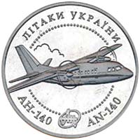 На аверсі монети в центрі в намистовому колі зображено малий Державний Герб України в оточенні алегоричної композиції із сонця, стилізованого крила, птахів та зірок, що втілює мрію людства досягти космічних висот, та кругові написи - УКРАЇНА, 2004, 5, ГРИВЕНЬ. На реверсі монети зображено літак АН-140 та між зовнішнім кантом монети і намистовим колом розміщено кругові написи: угорі - ЛІТАКИ УКРАЇНИ; унизу - АН-140 та AN-140, між якими розміщено логотип `АН`.