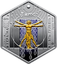 На аверсі монети `Людина, час, простір` розміщено: ліворуч: рік карбування монети 2018, малий Державний Герб України та написи UKRAINE/УКРАЇНА (вертикально); праворуч - номінал монети П`ЯТЬ ГРИВЕНЬ, позначення металу, маси монети в чистоті - Ag 999 15,55 (вертикально) та логотип Банкнотно-монетного двору Національного банку України (унизу); на тлі стилізованого зображення геліоцентричної системи світу як символу розвитку астрономії та філософії - рівняння Ейнштейна E=mc? (зв`язок між енергією та масою будь-якої речовини), що символізує теорію відносності, під якою на фіолетовому тлі, заповненому зображенням подвійної спіралі - символу генома людини (використано тамподрук), - Вітрувіанська людина з малюнка Леонардо да Вінчі, що символізує `канонічні пропорції` (локальна позолота).