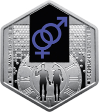 На реверсі монети розміщено: на тлі стилізованої схеми нуклеїнових кислот - годинник як символ вічності, часу та його швидкоплинності, у центрі якого - дзеркальні силуети чоловіка і жінки, над якими на чорному тлі зображено переплетені кольорові символи жіночої та чоловічої статі (використано тамподрук); вертикальні написи: THE HUMAN o TIME o SPACE (ліворуч) та ЛЮДИНА o ЧАС o ПРОСТІР (праворуч).