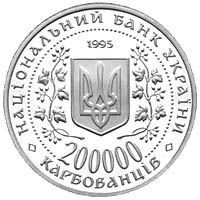 | На аверсі монети в центрі кола, утвореного намистовим узором, знаходиться зображення малого Державного Герба України в обрамленні з двох боків гілками калини. Кожна гілка має п`ять листків і три грона ягід. Верхнє гроно складається з семи ягід, середнє - з п`яти, нижнє - з шести. Над гербом розміщена дата 1995 - рік карбування монети, під гербом - у два рядки по колу напис 200000 КАРБОВАНЦІВ, який позначає номінальну вартість монети (число 200000 розміщено в розриві намистового узору). Між зовнішнім кантом і намистовим узором вгорі по колу напис НАЦІОНАЛЬНИЙ БАНК УКРАЇНИ, відокремлений з двох боків від слова КАРБОВАНЦІВ розділовими позначками у вигляді ромбів. |