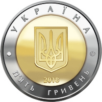 | На аверсі монети розміщено: написи півколом УКРАЇНА (угорі), П`ЯТЬ ГРИВЕНЬ (унизу), у центрі - малий Державний Герб України, під яким - рік карбування монети 2018; праворуч - логотип Банкнотно-монетного двору Національного банку України. |