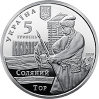 | На аверсі монети розміщено: угорі – малий Державний Герб України, ліворуч від якого напис УКРАЇНА (півколом) та номінал монети – 5/ГРИВЕНЬ; у центрі на дзеркальному тлі – стилізовану композицію, що відображає історичні періоди заснування міста: козак на тлі фрагмента дерев’яної фортеці, під якою стилізовані хвилі та напис: СОЛЯНИЙ/ ТОР; рік карбування монети – 2020 та логотип Банкнотно-монетного двору Національного банку України (праворуч від козака). |