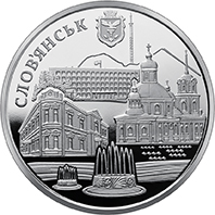На реверсі монети на тлі силуету гори Карачун зображено стилізовану композицію сучасного міста: угорі – герб міста Слов’янська, під яким адміністративний будинок міськради, історичні споруди – Свято-Воскресенська церква (праворуч), будинок міської лікарні (ліворуч), на передньому плані внизу – фонтан. |