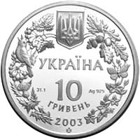 На аверсі монети в обрамленні вінка, утвореного із зображень окремих видів флори і фауни, розміщено малий Державний Герб України та написи в чотири рядки: на монеті із срібла - УКРАЇНА, 10 ГРИВЕНЬ, 2003, а також позначення металу та його проби - Ag 925, вага в чистоті - 31,1; та логотип Монетного двору Національного банку України.