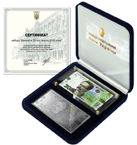 Колекційний набір `Банкноти 20 гривень зразка 2018 року` містить: сувенірну банкноту зі срібла, яка відтворює дизайн банкноти номіналом 20 гривень зразка 2018 року, виготовлену зі срібла 999,9 проби, маса в чистоті - не менше 124,4 г, розміри: 133 х 66 х 1,35 мм; елемент оздоблення - голограма; паперову банкноту номіналом 20 гривень зразка 2018 року (в оргсклі), розміри 69 х 130 мм.