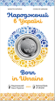 На реверсі монети зображено картину Олега Шупляка “Зв’язок”: на тлі стилізованого всесвіту – малюк-космонавт, який нерозривно пов’язаний пуповиною з матір’ю-Україною (карта України вгорі), ліворуч півколом розміщено дзеркальний напис НАРОДЖЕНИЙ В УКРАЇНІ. |