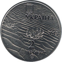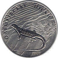 На реверсі монети на матовому тлі пустельного пейзажу зображено ящірку, угорі півколом - напис ОЛЕШКІВСЬКІ ПІСКИ. |