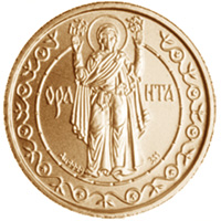 На реверсі монети в центрі кола, утвореного рослинним орнаментом, зображено фігуру Богоматері Оранти - головної мозаїки центральної апсиди храму. Фігура Богоматері поділяє навпіл горизонтально розташований напис ОРАНТА. Внизу над рослинним орнаментом розташовані позначення і проба дорогоцінного металу та його вага у чистоті |