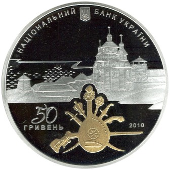 На аверсі монети угорі розміщено: малий Державний Герб України, напис півколом НАЦІОНАЛЬНИЙ БАНК УКРАЇНИ, зображено фрагмент історико-культурного комплексу `Запорізька Січ`, на передньому плані - позолочена композиція з бандури, козацьких клейнодів і зброї, ліворуч від якої номінал монети - 50/ ГРИВЕНЬ, праворуч - рік карбування монети - 2010.