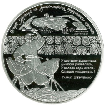 На реверсі монети розміщено: на тлі орнаментальної смуги довбиша, який б`є у литаври, що використовувалися під час урочистостей та важливих моментів життя козаків, праворуч від яких рядки з поезії Тараса Шевченка `І мертвим, і живим…` - У нас воля виростала,/ Дніпром умивалась,/ У голови гори слала,/ Степом укривалась!/ ТАРАС ШЕВЧЕНКО; над смугою стилізоване зображення острова, над яким напис - Острів Хортиця на Дніпрі - колиска українського козацтва, праворуч напис - ЗАПОРІЖЖЯ/ XVI - XVIII ст.
