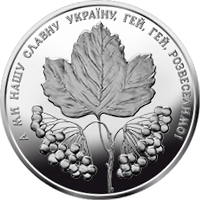 На реверсі монети на дзеркальному тлі розміщено: угорі півколом напис – продовження пісні: А МИ НАШУ СЛАВНУ УКРАЇНУ, ГЕЙ, ГЕЙ, РОЗВЕСЕЛИМО!; у центрі зображено гілку – листок і ягоди калини.
