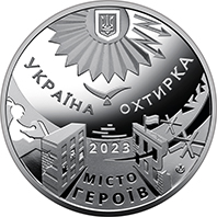 | На аверсі медалі розміщено: угорі, на тлі стилізованого сяючого сонця з блискавками (символізують покарання для агресорів) – малий Державний Герб України, під яким птах як символ звільнення та написи півколом: УКРАЇНА (ліворуч), ОХТИРКА (праворуч); унизу – стилізована композиція: місто, що зазнає ворожих бомбардувань, праворуч – слід від ракети, що влучає в будівлю міської ради, ліворуч – житловий будинок, за яким грається дитина; на тлі композиції написи: 2023/МІСТО/ГЕРОЇВ; логотип Банкнотно-монетного двору Національного банку України (праворуч). |