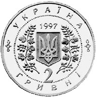 | На аверсі монети в центрі кола, утвореного намистовим узором, розміщено зображення малого Державного герба України в обрамленні гілок калини. Над гербом розміщена дата 1997 - рік карбування монети. По колу написи: вгорі УКРАЇНА, внизу у два рядки 2 ГРИВНІ. Написи відокремлені один від одного декоративними знаками |
