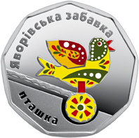 На реверсі монети на дзеркальному тлі розміщено кольорове зображення дерев’яної яворівської пташки (використано тамподрук) та написи: ЯВОРІВСЬКА ЗАБАВКА (угорі півколом), ПТАШКА (унизу ліворуч). |