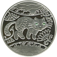 На реверсі монети в оточенні стилізованого рослинного орнаменту зображено в лубочному стилі кота (очі із зеленого альпініту). Над цією композицією і під нею розміщено абрисні фігурки всіх 12 символів східного календаря. |