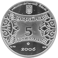 | На аверсі монети в оточенні рослинного орнаменту, виконаного технікою примітивізму, розміщено написи: УКРАЇНА/ 5/ ГРИВЕНЬ; угорі - малий Державний Герб України, над яким - напис НАЦІОНАЛЬНИЙ БАНК, унизу - рік карбування монети 2006, а також позначення металу, його проби - Ag 925, маси в чистоті - 15,55 та логотип Монетного двору Національного банку України. |