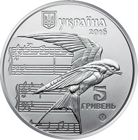 На аверсі монети на матовому тлі розміщено: угорі малий Державний Герб України, праворуч від якого напис УКРАЇНА, під яким рік карбування монети 2016, на тлі нотних рядків рельєфне зображення ластівки, під якою праворуч номінал - 5/ГРИВЕНЬ та логотип Бакнотно-монетного двору Національного банку України.