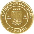 | На аверсі монети в намистовому колі розміщено малий Державний Герб України, над яким - рік карбування монети - 2008; між намистовим колом і кантом монети - написи: НАЦІОНАЛЬНИЙ БАНК УКРАЇНИ (угорі), 2 ГРИВНІ (унизу), а також позначення металу, його проби - Au 999,9 (ліворуч), маса - 1,24 та логотип Монетного двору Національного банку України (праворуч). |