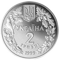 | На аверсі монети в обрамленні вінка, утвореного із зображень окремих видів флори і фауни, розміщено малий Державний герб України і написи у чотири рядки УКРАЇНА,2, ГРИВНІ, 1999. |