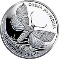 На реверсі монети на дзеркальному тлі зображено совку розкішну та написи півколом: СОВКА РОЗКІШНА (угорі праворуч), STAUROPHORA CELSIA (унизу ліворуч).