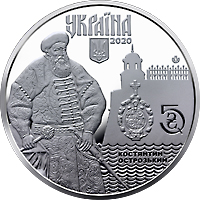 | На аверсі монети розміщено: угорі напис УКРАЇНА, під яким – малий Державний Герб України та праворуч рік карбування монети – 2020; ліворуч на дзеркальному тлі зображено Костянтина Острозького, праворуч від якого – герб Острозьких та номінал монети – 5 ? на тлі стилізованого Дубенського замку; унизу праворуч на тлі стилізованих хвиль напис – КОСТЯНТИН/ ОСТРОЗЬКИЙ; логотип Банкнотно-монетного двору Національного банку України (праворуч). |