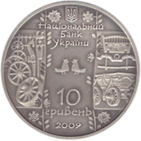 | На аверсі монети розміщено: угорі малий Державний Герб України, під яким стилізований напис - НАЦІОНАЛЬНИЙ/БАНК/УКРАЇНИ, у центрі - стилізоване зображення двох півників, ліворуч і праворуч - продукція стельмаського ремесла - вози, ярма, колеса, сани, притика. Декоративна орнаментальна центральна частина аверсу містить написи - 10/ ГРИВЕНЬ/ 2009. |