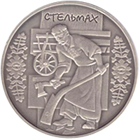 Присвячена професії деревообробника. Стельмаство, основне призначення якого - виготовлення коліс, саней, возів, дуг тощо, відоме в Україні з давніх-давен і було одним з найпоширеніших промислів. Монету виготовлено з використанням технології патинування.