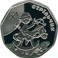 На реверсі монети зображено стилізовану композицію - ліворуч на матовому тлі символ знака зодіаку Стрільця, у центрі на конику - хлопчик із луком та стрілами, угорі праворуч напис - СТРІЛЬЧИК. |