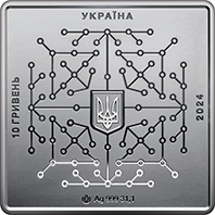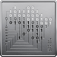 | На аверсі монети в центрі композиції розміщено малий Державний Герб України, оточений електронною схемою / мережею. Ця комбінація символізує