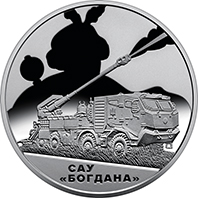 На реверсі монети зображено самохідну артилерійську установку “Богдана” у момент бойового розгортання на степовому ландшафті, що підкреслює її мобільність та пристосованість до різних умов ведення бою. У динаміці пострілу передано міць української артилерії, а на тлі монети – силует портрета Богдана Хмельницького, що символізує незламний дух українського воїнства та історичну вісь, яка об’єднує минуле і сьогодення в боротьбі за незалежність. У нижній частині монети – напис САУ “БОГДАНА”. |