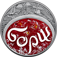 На реверсі монет розміщено стилізовану композицію, що наповнена традиційним українським колоритом та побутом: у центрі зображено тарілку з борщем, що неначе “бурхливе озеро” символізує глибинну українську культуру і традиції, напис – БОРЩ (елемент оздоблення – тамподрук). |