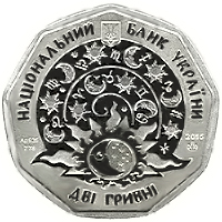 | На аверсі монети розміщено: угорі малий Державний Герб України, написи: угорі півколом - НАЦІОНАЛЬНИЙ БАНК УКРАЇНИ, унизу - номінал ДВІ ГРИВНІ та стилізовану композицію - на тлі зіркового неба зображення знаків зодіаку, місяця та сонця; рік карбування монети 2015 та логотип Монетного двору Національного банку України (праворуч), позначення металу, проби та маси Ag 925/7,78 (ліворуч). |