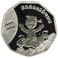 На реверсі монети зображено стилізовану композицію - ліворуч на матовому тлі символ знака зодіаку Водолія, у центрі на траві - хлопчик, угорі напис - ВОДОЛІЙЧИК. |