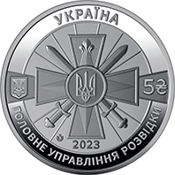 | На аверсі монети розміщено: у центрі на матовому тлі – емблема Головного управління розвідки Міністерства оборони України, ліворуч від неї – малий Державний Герб України; праворуч – номінал 5 та графічний символ гривні; написи: УКРАЇНА (півколом угорі), 2023/ГОЛОВНЕ УПРАВЛІННЯ РОЗВІДКИ (унизу); логотип Банкнотно-монетного двору Національного банку України (ліворуч від емблеми). |