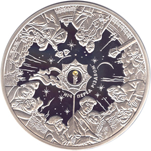 Присвячена творчості М.Гоголя, який створив поетичний образ українського народу, з надзвичайною художньою силою розкрив його самобутній характер з притаманним йому почуттям гумору, а ліричний образ України, створений ним у творі `Вечори на хуторі біля Диканьки`, назавжди ввійшов до європейської літератури. Сюжет однієї з найяскравіших повістей збірки - `Ніч перед Різдвом` є головною темою композиції монети. Елементи оздоблення монети - сапфір жовтий масою 0,06 карата, локальна позолота (вміст золота - 0,000048 г).